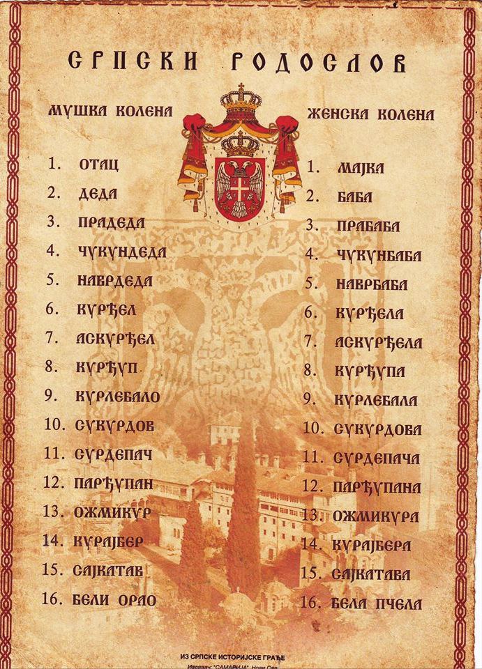,,Srbi su jedini narod na svetu koji ima nazive za 16 svojih predaka unazad, odnosno kolena ili pasova, počev od belog orla i sajkatava, preko kurajbera i omžikura do surdepača i kurebala. Kod većine drugih naroda ta predačka nit u nazivima se završava sa četvritim kolenom, sa čukundedom, a svi ostali u nizu su daleki preci jer nemaju nazive za njih.“